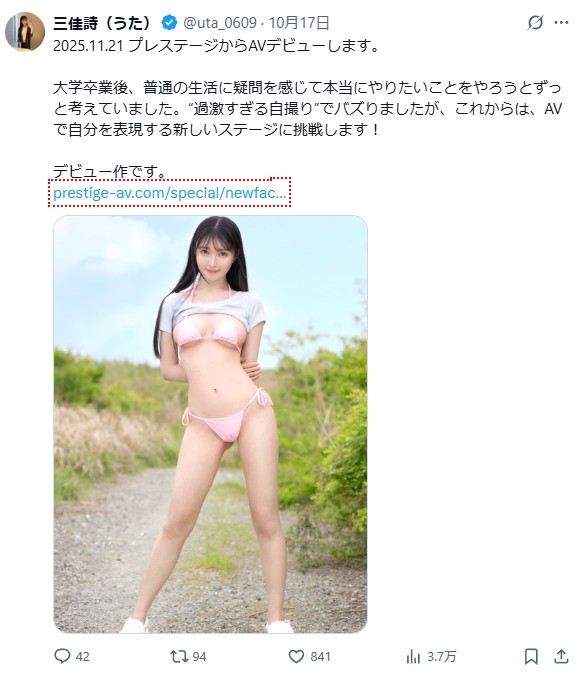プレステージということは順当にいけばAVデビューしそうです... 2025.10.20 三佳詩 |
